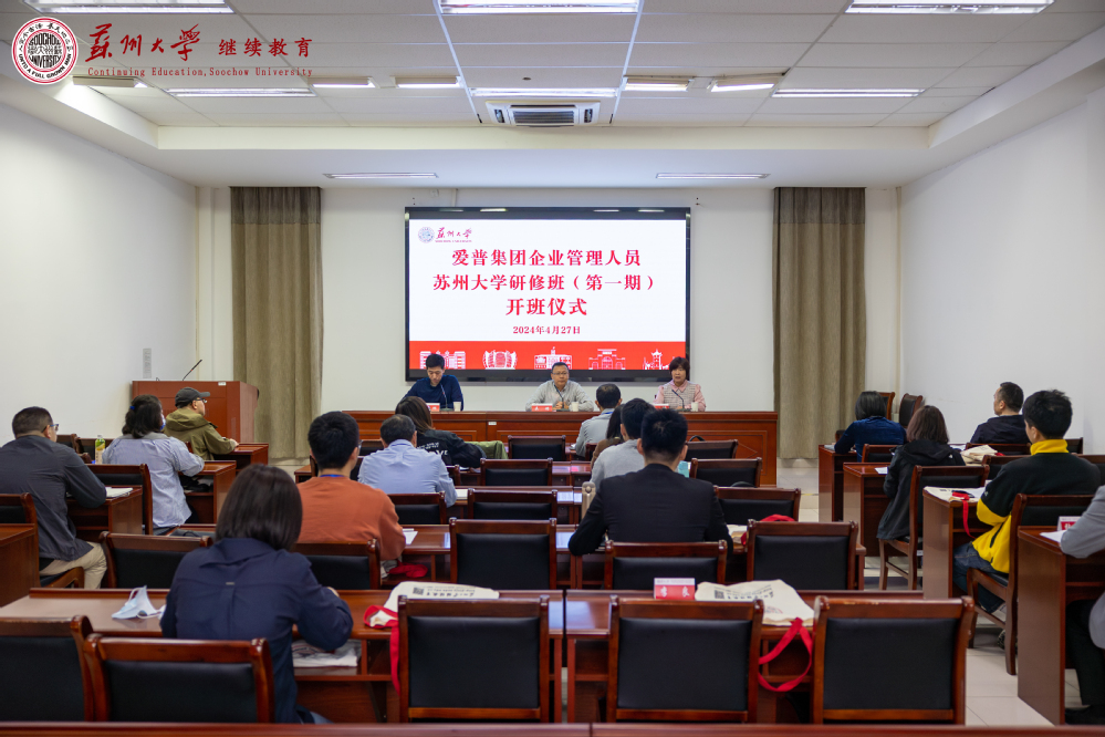 4月27日,爱普集团企业管理人员苏州大学研修班(第一期)在苏州大学天赐庄校区继续教育学院培训中心101教室顺利开班,来自集团的21名中层以上管理干部参加本次培训。苏州爱普电器有限公司的总经理助理吴铭、苏州大学继续教育学院的副院长董娜等领导出席了开班仪式,仪式由苏州大学产业人才培训学院院长助理李琳主持。